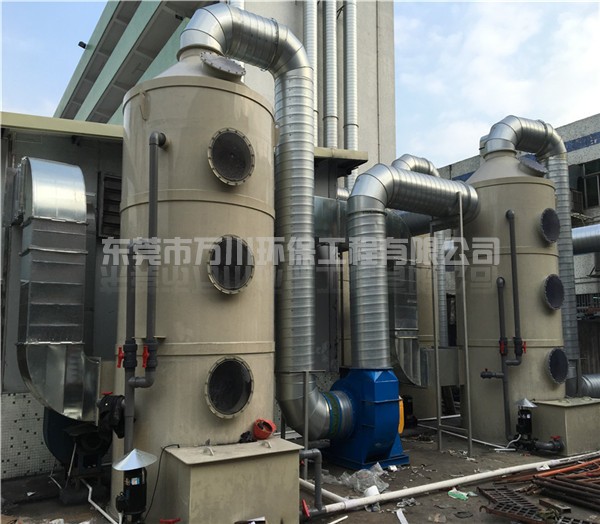 根據(jù)氨氣具有易溶于水的特點,氨氣可以使用噴淋塔處理。氨氣廢氣從風(fēng)管進入噴淋塔,經(jīng)過噴淋層,噴淋頭不斷的向下噴水,由下到上不間斷地噴水,氨氣的濃度越來越低,最后達標排放,收集起來的氨水還可以重新利用。